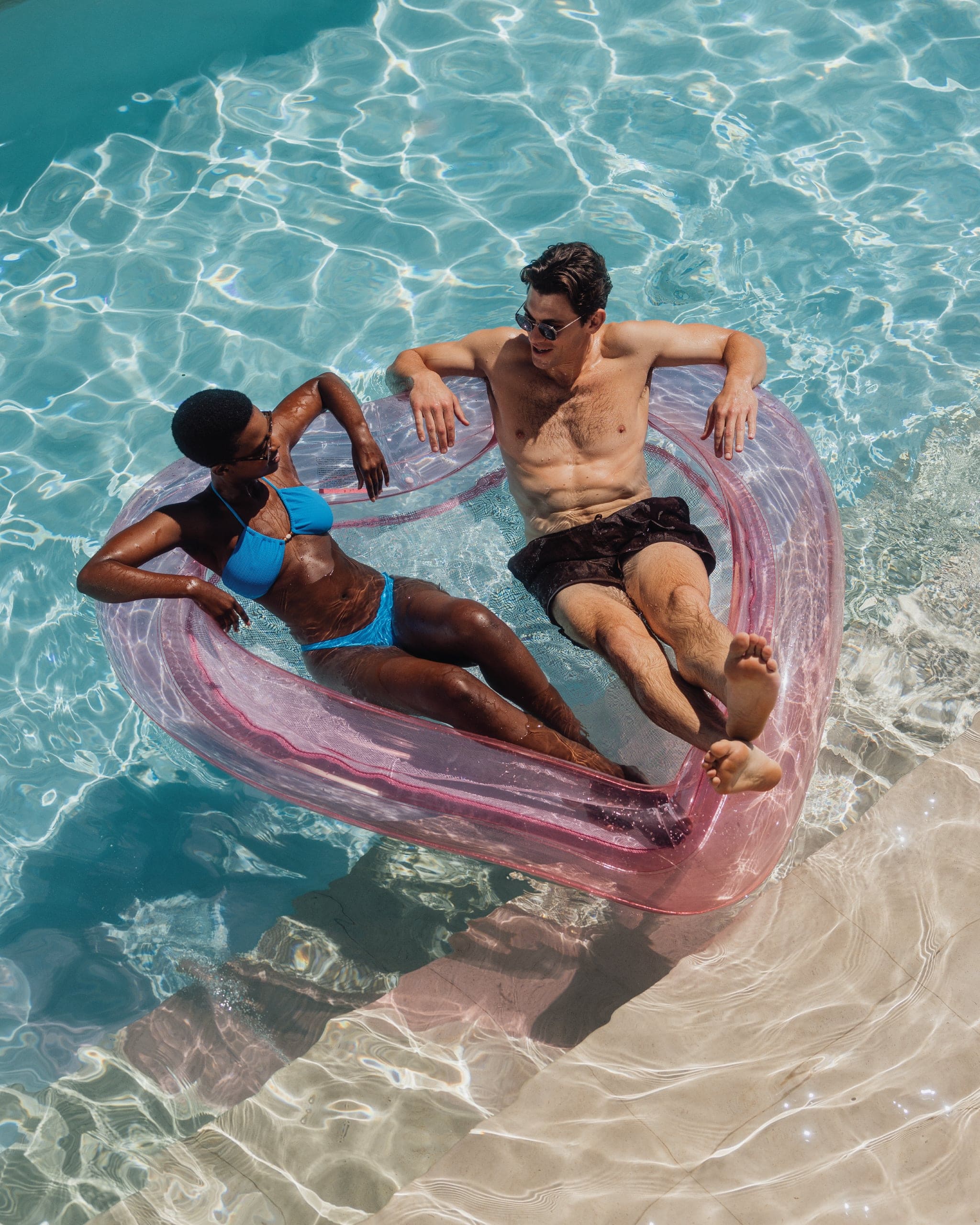 We re-imagined our world famous heart pool into the ultimate floating mesh lounger. Oversized 70” design fits two adults to float in blissful perfection. Clear light pink material blends perfectly with your aquatic surroundings.